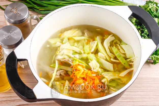 Добавьте зажарку в кастрюлю с курицей. Снимите с капусты верхние листья, нарежьте ее лентами любого размера по вашему вкусу. Отварите примерно 5-6 минут - до мягкости капусты.