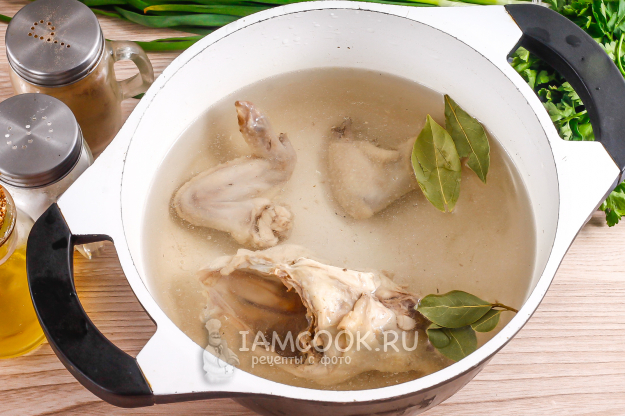 Снова залейте горячей водой части курицы, добавьте соль и лавровые листья. Отварите примерно 20 минут на умеренном нагреве, прикрыв емкость крышкой.