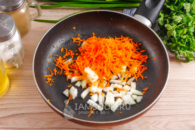 Очистите морковь и лук от кожуры, промойте в воде. Нарежьте лук мелкими кубиками, а морковь натрите на терке с мелкими ячейками. Отпассеруйте на сковороде с антипригарным покрытием примерно 2-3 минуты или смажьте предварительно сковороду растительным маслом без аромата.