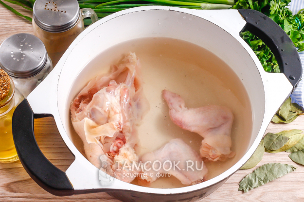 Части курицы выложите в казан или кастрюлю влейте теплую воду и отварите примерно 5 минут с момента закипания воды в емкости. Затем слейте бульон.