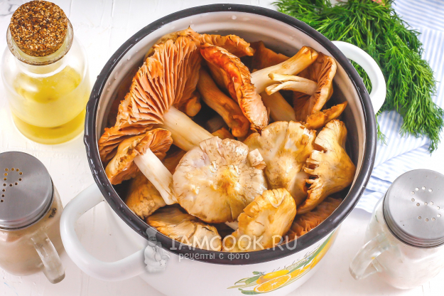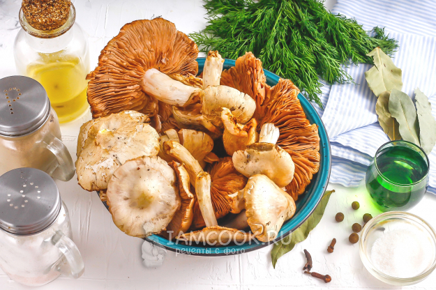 Подготовьте необходимые ингредиенты для заготовки маринованных сыроежек на зиму.