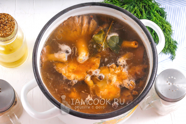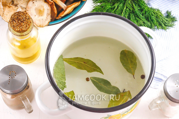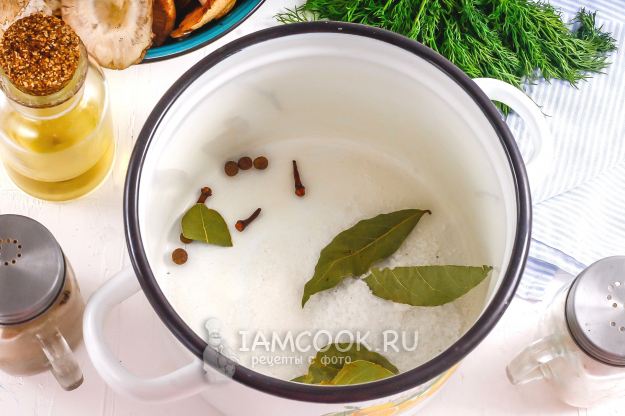 Тщательно промойте все собранные сыроежки, вырезая подпорченные или сильно загрязненные места. В кастрюлю или казан всыпьте все специи и пряности, добавьте соль.