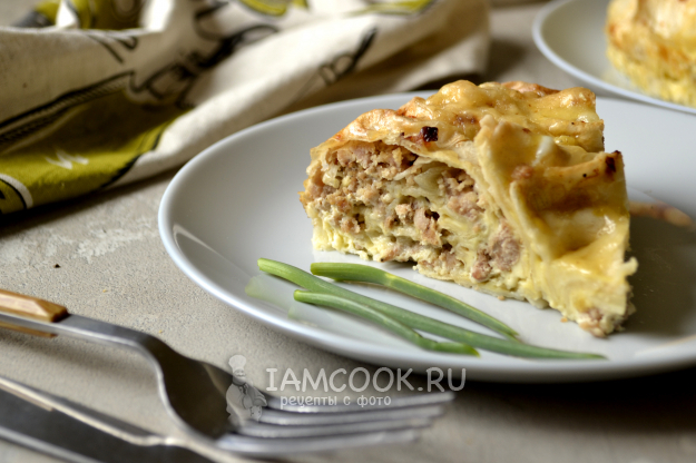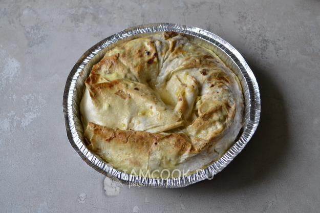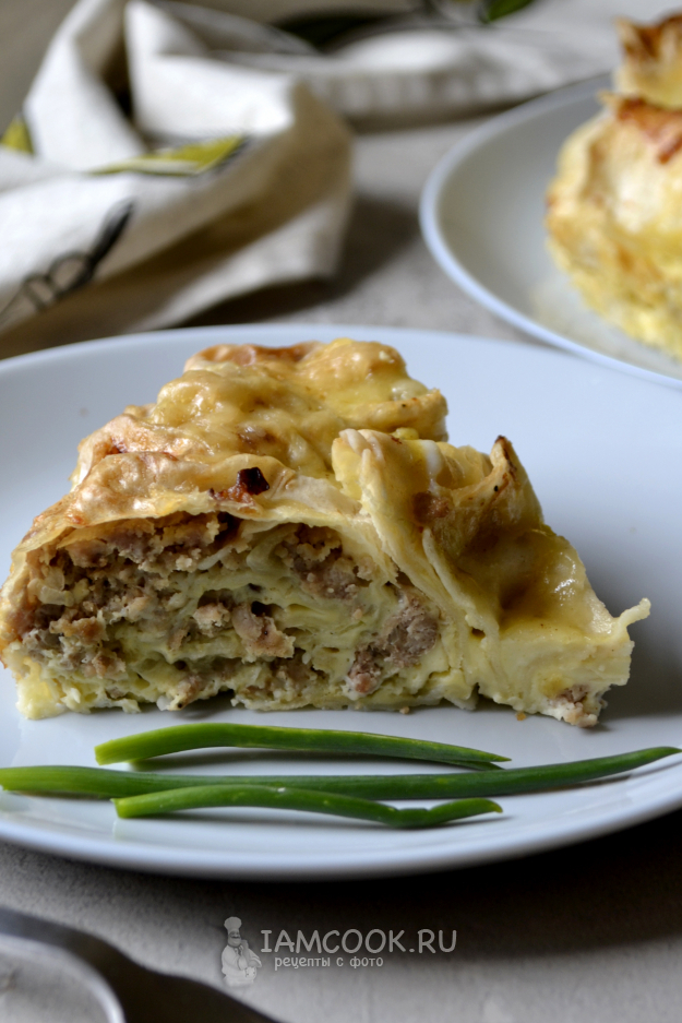 Заливной пирог из лаваша с фаршем готов. Аккуратно переложите его на плоскую тарелку.