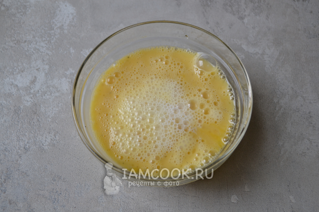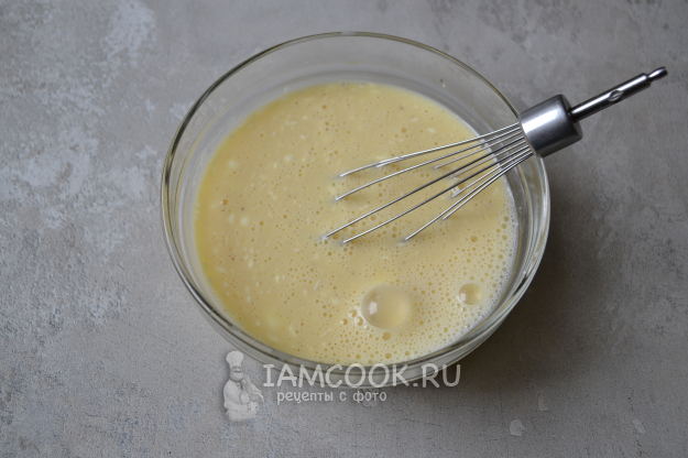 Взболтайте яйца и влейте молоко.