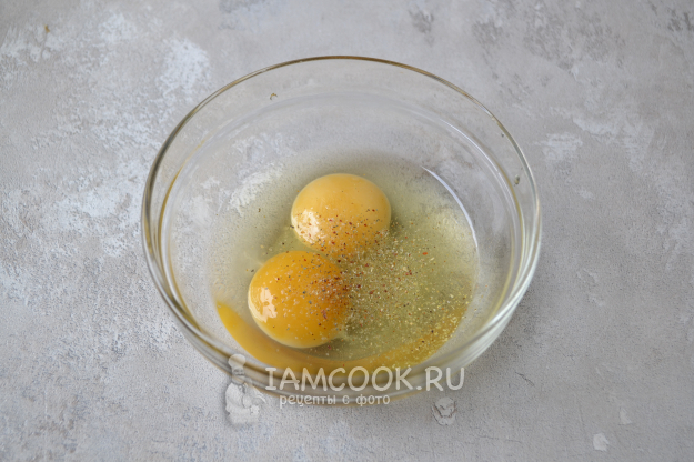Для заливки разбейте два яйца в небольшую мисочку, посолите и присыпьте приправой для мяса или любыми специями, которые вам по вкусу.