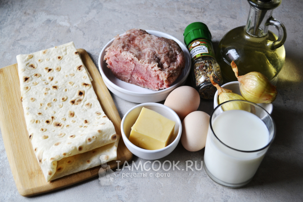 Подготовьте продукты для заливного пирога из лаваша с фаршем.