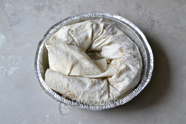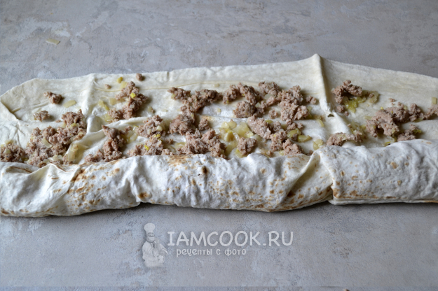 Начиная с широкого края, начните сворачивать лаваш в плотный рулет.