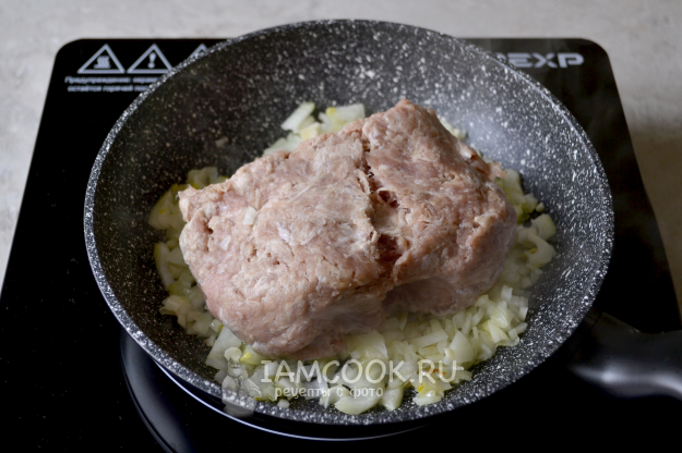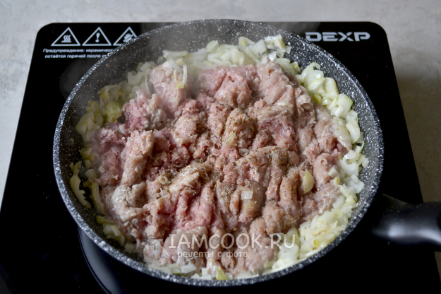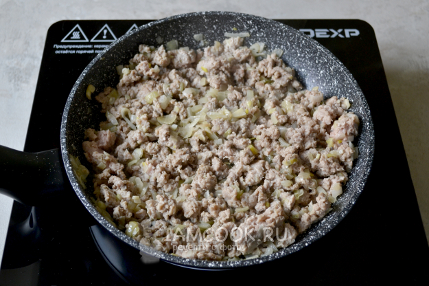 Обжаривайте фарш с луком на среднем огне почти до готовности.