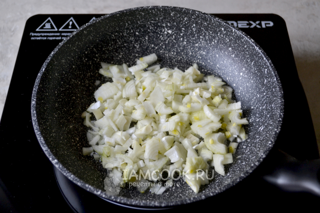Очищенный и мелко нарезанный лук обжарьте на сковороде с растительным маслом до прозрачного цвета на среднем огне.
