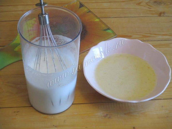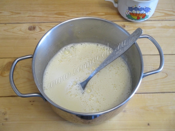 Разотрите желтки с мукой и перемешайте эту массу с молоком. Белки взбейте с сахаром в пену.