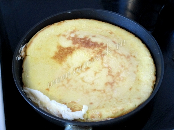 Через несколько минут, когда нижняя сторона омлета схватится, нужно омлет аккуратно перевернуть и продолжить приготовление.
