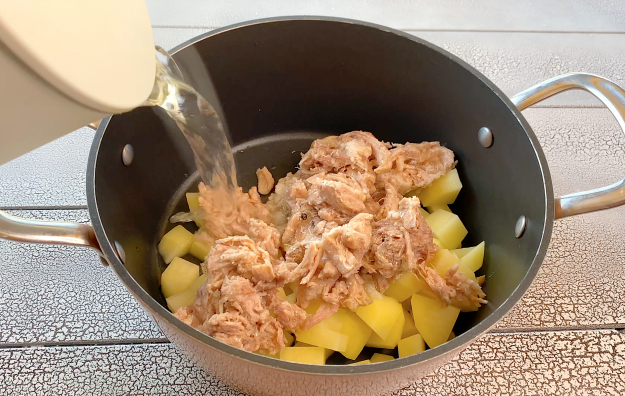 Добавьте тушенку и залейте крутым кипятком. Поставьте на средний огонь и варите около 15-20 минут.
