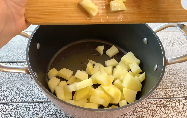 Очистите и промойте картофель. Нарежьте на небольшие кусочки и выложите в кастрюлю.