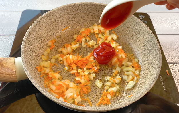 Очистите овощи. Лук мелко нарежьте, морковь натрите на терке, затем выложите в разогретую с растительным маслом сковороду и обжарьте до мягкости. Добавьте томатный соус.