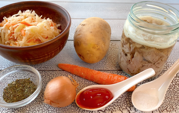 Первым делом подготовьте все необходимые продукты для приготовления щей из квашеной капусты с тушенкой.