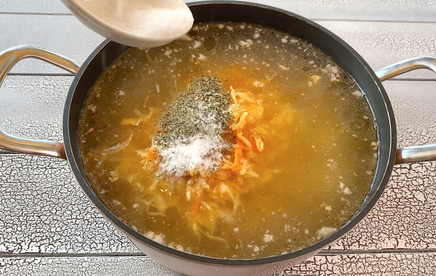 Выложите тушеную капусту в бульон, добавьте сушеную зелень, перемешайте. Попробуйте бульон, если необходимо - посолите и поперчите. По желанию добавьте любимые специи. Накройте крышкой и варите щи из квашеной капусты с тушенкой на слабом огне 20 минут.