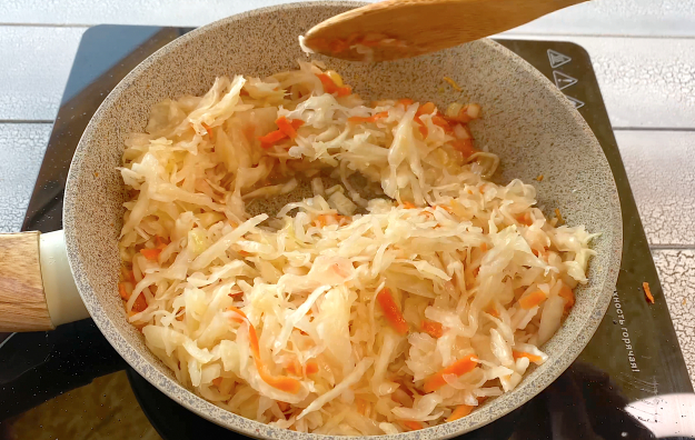 Выложите квашеную капусту, перемешайте, накройте крышкой и тушите около 20-25 минут на умеренном огне.