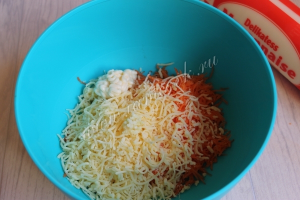 Почистим морковку и натрем ее на мелкой терке. Смешаем все вместе (сыр, морковь, орехи), выдавим чеснок и добавим майонез. Формуем шарики из этой массы. Укладываем их сразу на блюдо. Зеленью украшаем и делаем хвостики, я взяла веточки от помидорок.