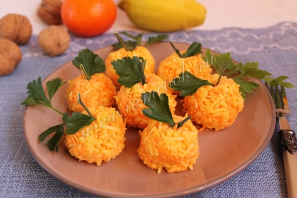 Все ингредиенты данной закуски, а именно морковь, сыр, чеснок и орехи прекрасно сочетаются по вкусу. Кроме того закуска в виде персиков хорошо смотрится на столе. Предлагаю приготовить такие овощные персики на любой праздничный стол, правда у меня они получились больше похожими на абрикосы.