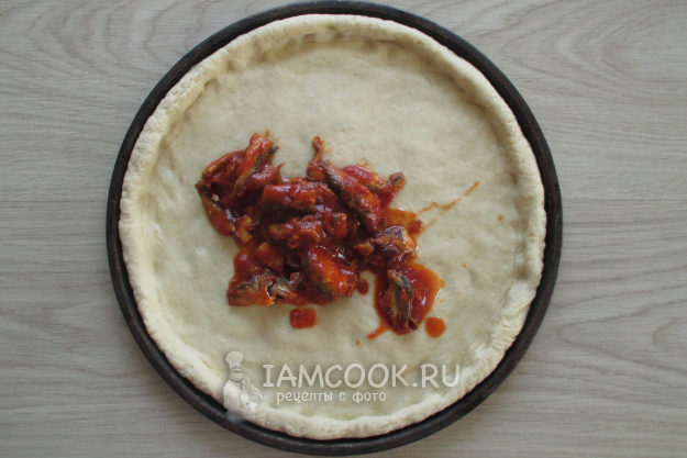 Раскатайте тесто в круглую тонкую заготовку, сделайте бортики, например, пышненькие. Уложите кильку с томатным соусом и равномерно распределите их по поверхности теста.