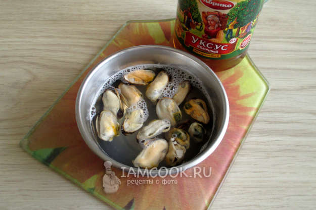 Пока тесто поднимается, приготовьте начинку. Замороженных мидий залейте кипятком в количестве примерно полстакана и добавьте яблочный уксус. Сыр натрите, свежую зелень порубите.