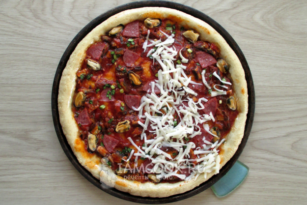 Поместите заготовку пиццы в духовку, разогретую до 200-220 градусов. Через 10-12 минут достаньте, посыпьте тёртым сыром.