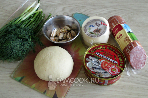 Ингредиенты для пиццы с килькой в томатном соусе подготовьте по списку к рецепту.
