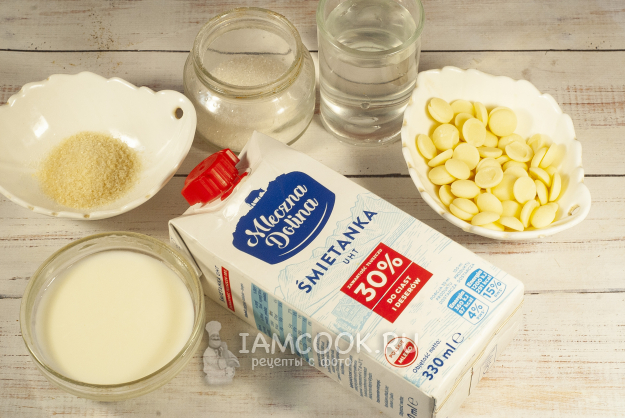 Подготовим необходимые ингредиенты для сливочного мусса с белым шоколадом. Шоколад я использую белый бельгийский в каллетах ТМ Каллебаут. Можно заменить пористым. Сахар, кроме ванильного, не добавляем.