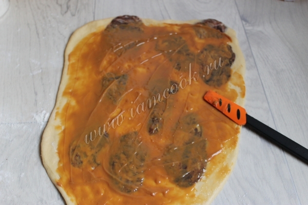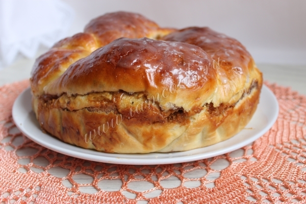 А потом в такое колечко. Укладываем в любую форму или просто на лист, смажем взбитым яйцом. Дадим постоять минут 30 и ставим в духовку на 20 минут, выпекаем при 180 градусах.