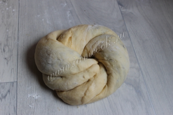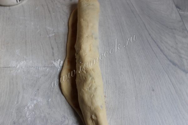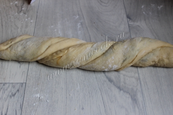 То же самое проделаем с другой половинкой теста. И скрутим два рулета вот таким образом, как на фото, в виде косички.