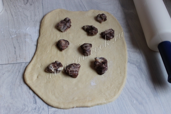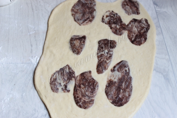 Раскатываем светлое тесто в пласт. Коричневое тесто делим пополам. И такие маленькие кусочки и кладем на тесто.