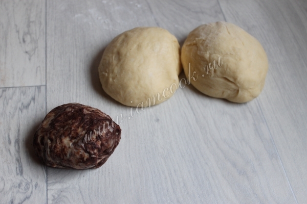 Отщипываем кусочек теста и добавляем в него какао. Вымесим. А остальное тесто делим на две части.