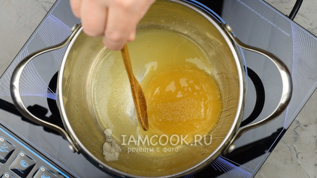 На плиту поставим кастрюльку с разбухшим желатином и на маленьком огне растопим его, постоянно помешивая ложкой и не давая закипеть.