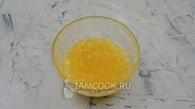 В объемную миску высыплем сахар, добавим сметану и миксером на небольшой скорости взобьем ингредиенты до растворения сахара.