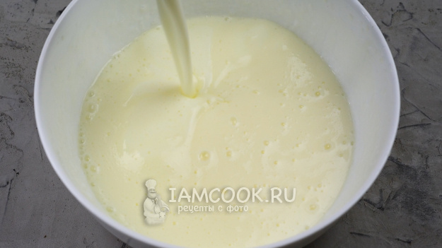 Яично-молочную смесь (охлаждать не надо) зальем в миску к сметанной смеси. Венчиком все хорошенько перемешаем.