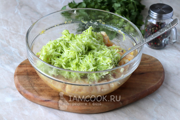 Затем натрите молоденький кабачок на тёрке со средними ячейками, лишнюю жидкость отожмите, а кабачковую стружку добавьте в миску с фаршем. Если кабачок имеет старую твёрдую кожицу - лучше её счистить.