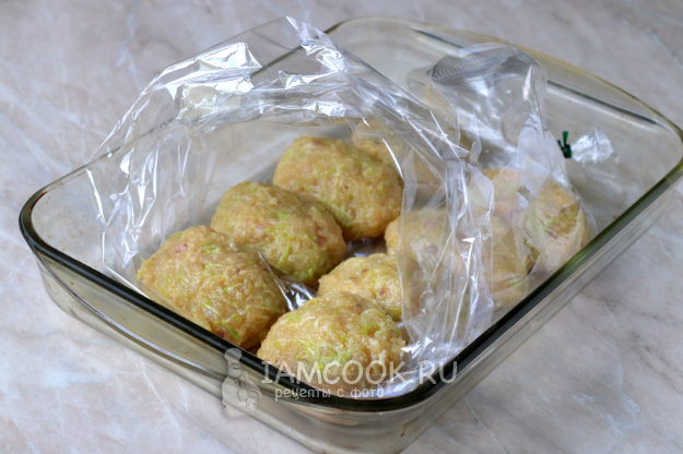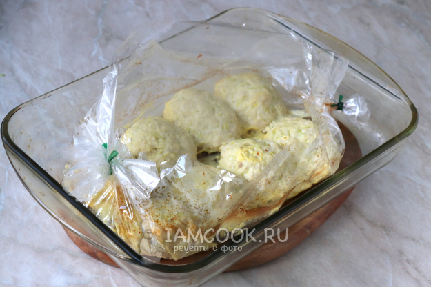 По истечению времени сформируйте из фарша небольшие котлеты и выложите их в рукав для запекания.