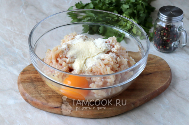 Возьмите продукты для приготовления куриных котлет с кабачком в духовке.