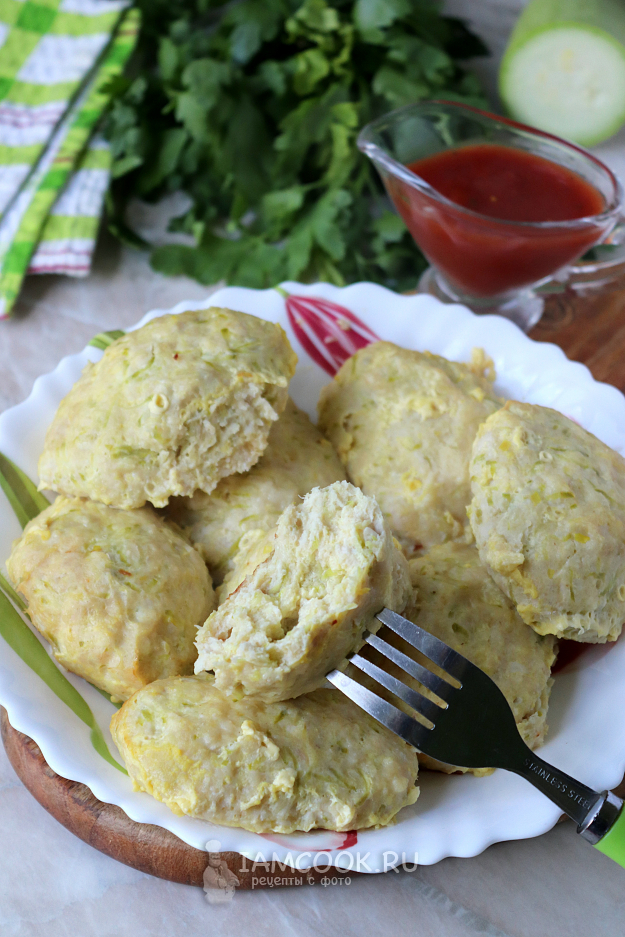 Очень вкусные, сочные котлеты из куриного фарша с кабачком готовы. Аккуратно, чтобы не обжечься паром, разрежьте рукав и переложите котлеты на тарелку. На стол подавайте их в тёплом виде с любым гарниром, овощами или зеленью.