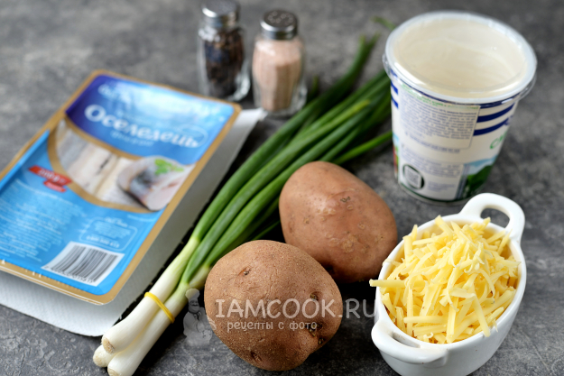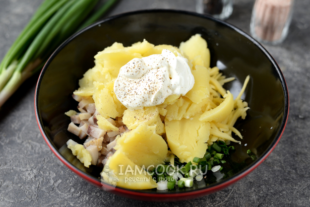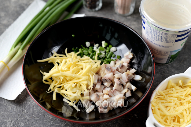 Мелко нарежьте филе селедки, зеленый лук, добавьте большую часть натертого твердого сыра.
