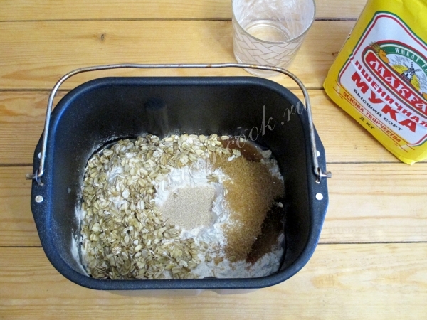 Добавьте муку, демерару и ли сахар, хлопья и сверху дрожжи.