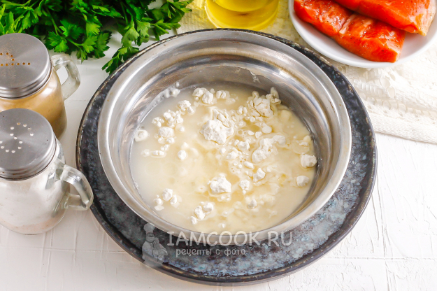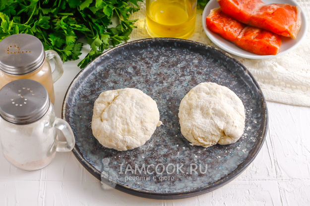 Возьмите необходимые ингредиенты для приготовления лепешки с красной рыбой и творожным сыром.