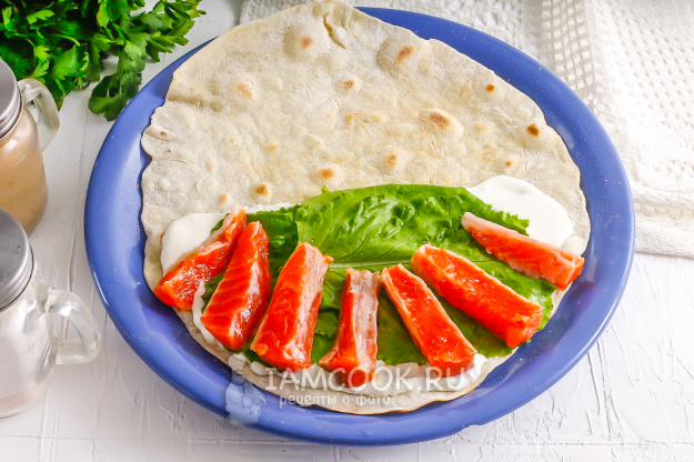 Слегка сбрызните лепешку водой, остудите и одну половину обмажьте творожным сыром. Выложите на него промытые листья салата. Можно заменить их листьями шпината, руколы и т.д. - ориентируйтесь по своему вкусу.