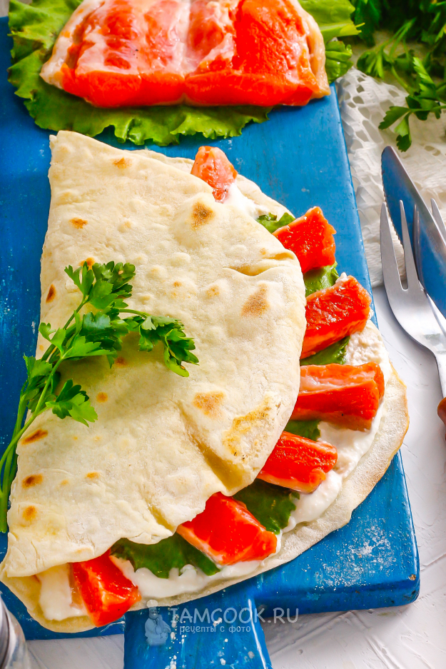 Аккуратно прикройте второй половиной лепешки и подайте "бутерброд" из лепешки с красной рыбой и творожным сыром к столу. Можно напечь лепешек чуть больше и хранить их под полотенцем, сбрызнув водой, чтобы они не подсохли. Так у вас всегда будет в наличии основа для перекусов.