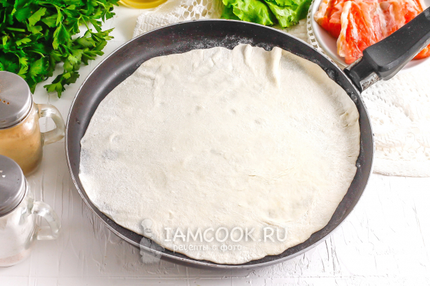 Затем раскатайте в тонкий округлый пласт. Так как лепешек понадобится одна или две, то нет смысла готовить много теста. Но если у вас большая семья, то увеличьте набор продуктов для создания лепешек. Раскалите сковороду и выложите на нее раскатанное тесто. Обжарьте примерно по минуте с обеих сторон.