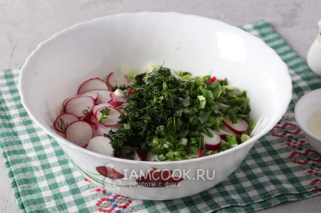 Вымыть редиску, обрезать хвостики. Нарезать редиску кружочками.