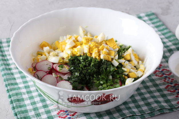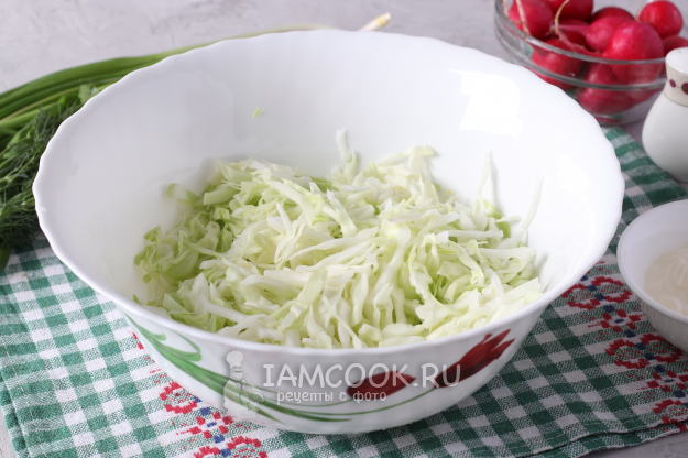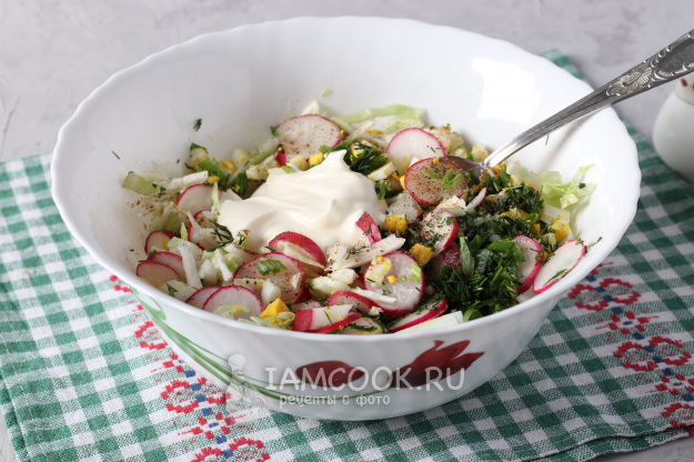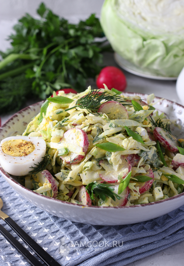 Поместить салат с редиской, капустой и яйцом в удобный салатник и подать к столу.