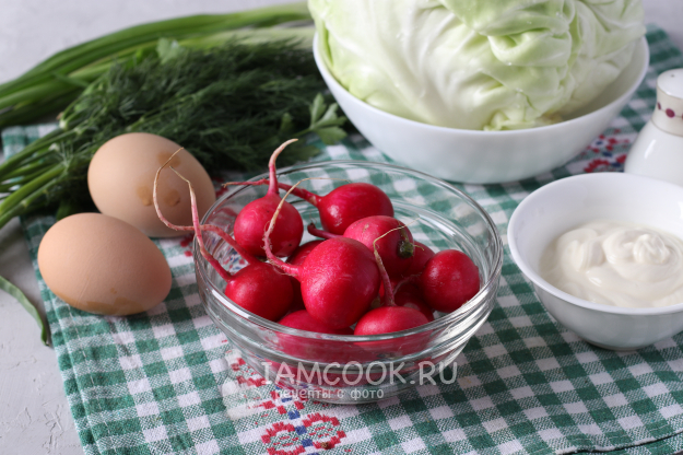 Для приготовления салата с редиской, капустой и яйцом подготовить из списка необходимые ингредиенты. Поставить варить яйца не более 10 минут.