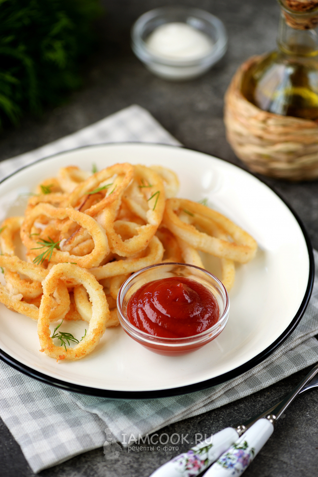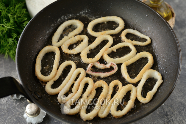 Разогрейте в сковороде растительное рафинированное масло, выкладывайте в него небольшими порциями запанированные в муке кольца кальмаров и жарьте на сильном огне секунд по 30-40 с обеих сторон. Готовые кольца сразу же выкладывайте на бумажные полотенца, чтобы максимально убрать остатки масла.