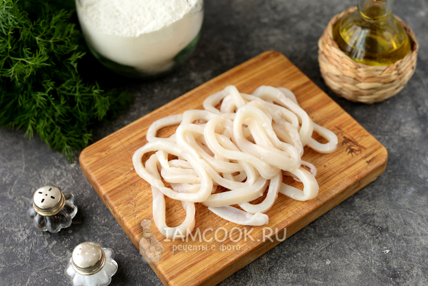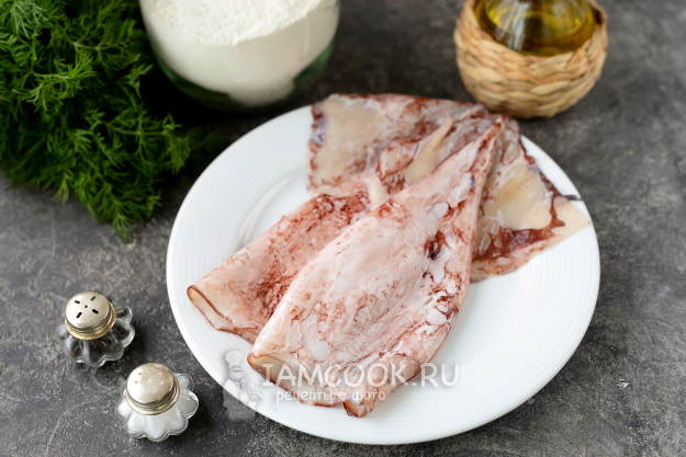 Для приготовления жареных кальмаров в муке нам понадобятся все продукты, что на фото. Разморозьте кальмаров при комнатной температуре, удалите внутренности и хитиновую жилку, промойте тщательно.